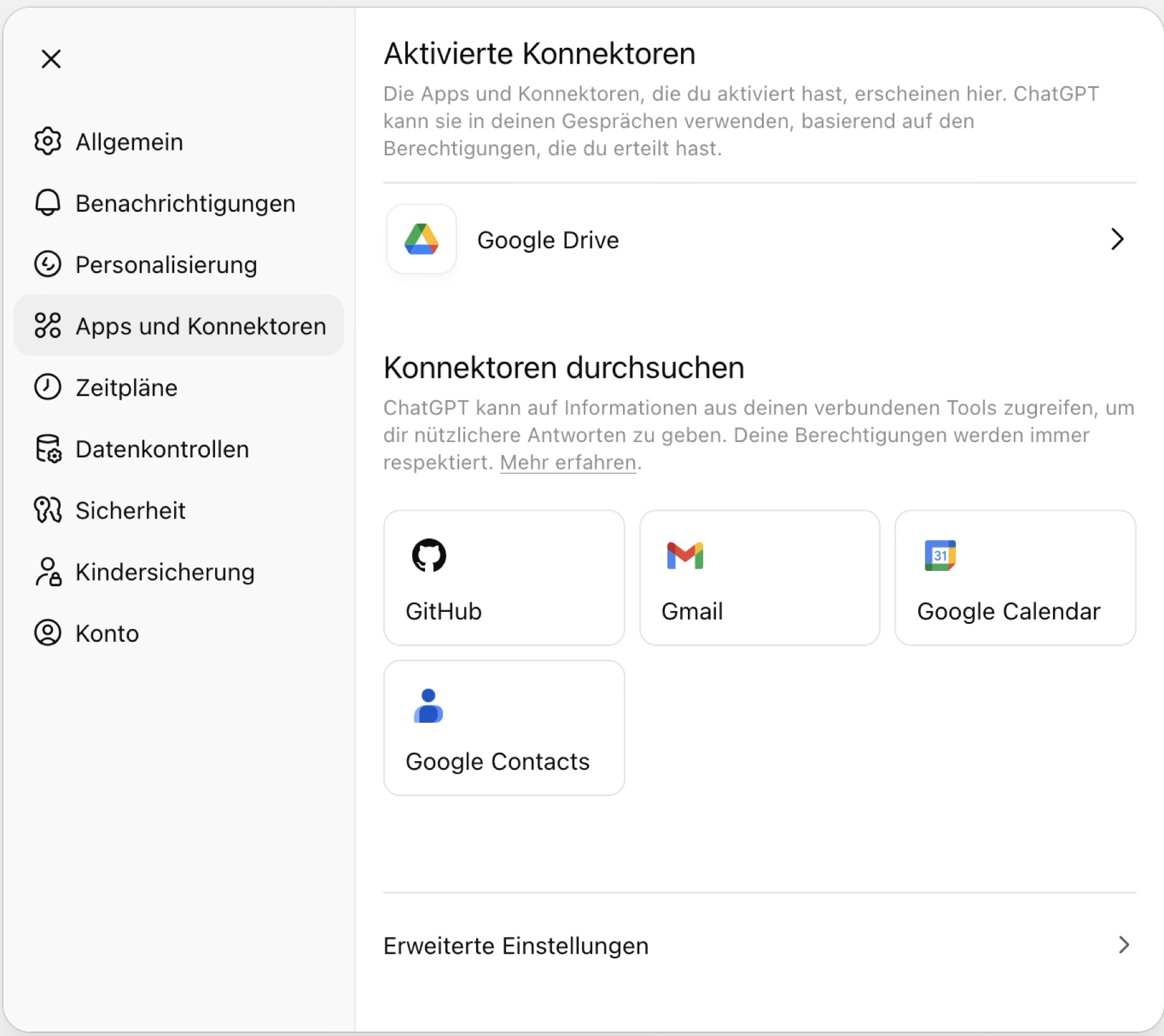 Bereich für App-Integrationen („Konnektoren“), z. B. Google Drive, Gmail, Kalender, Slack usw.