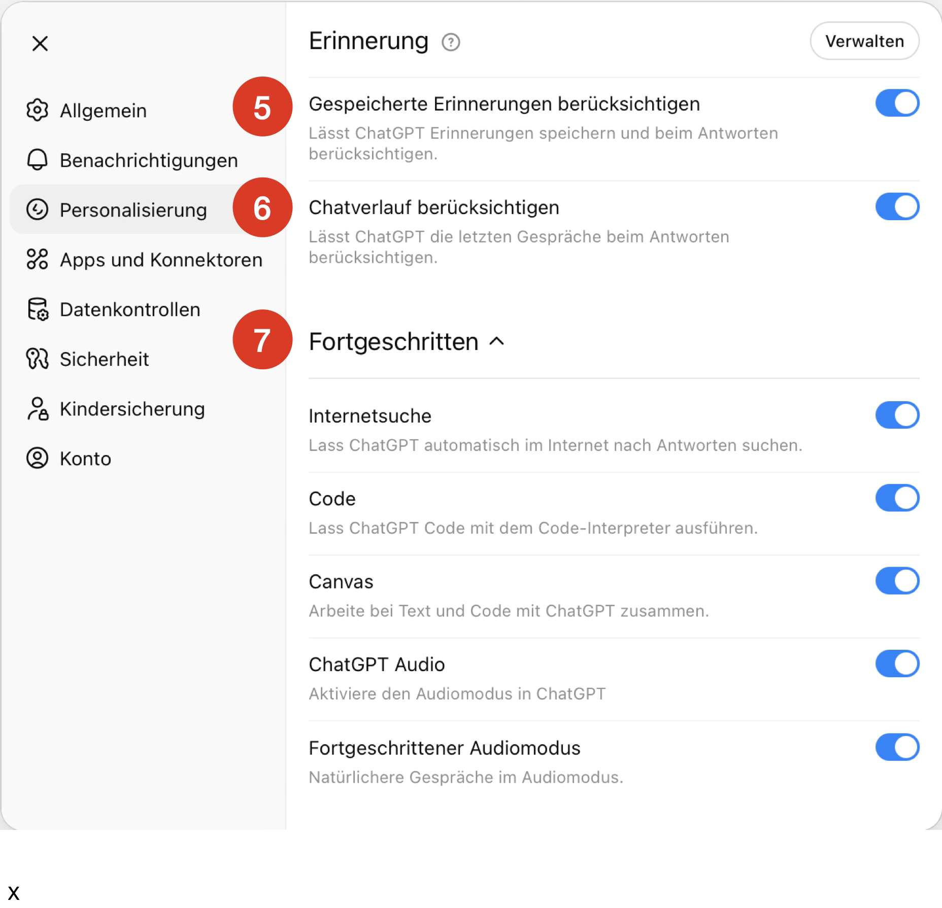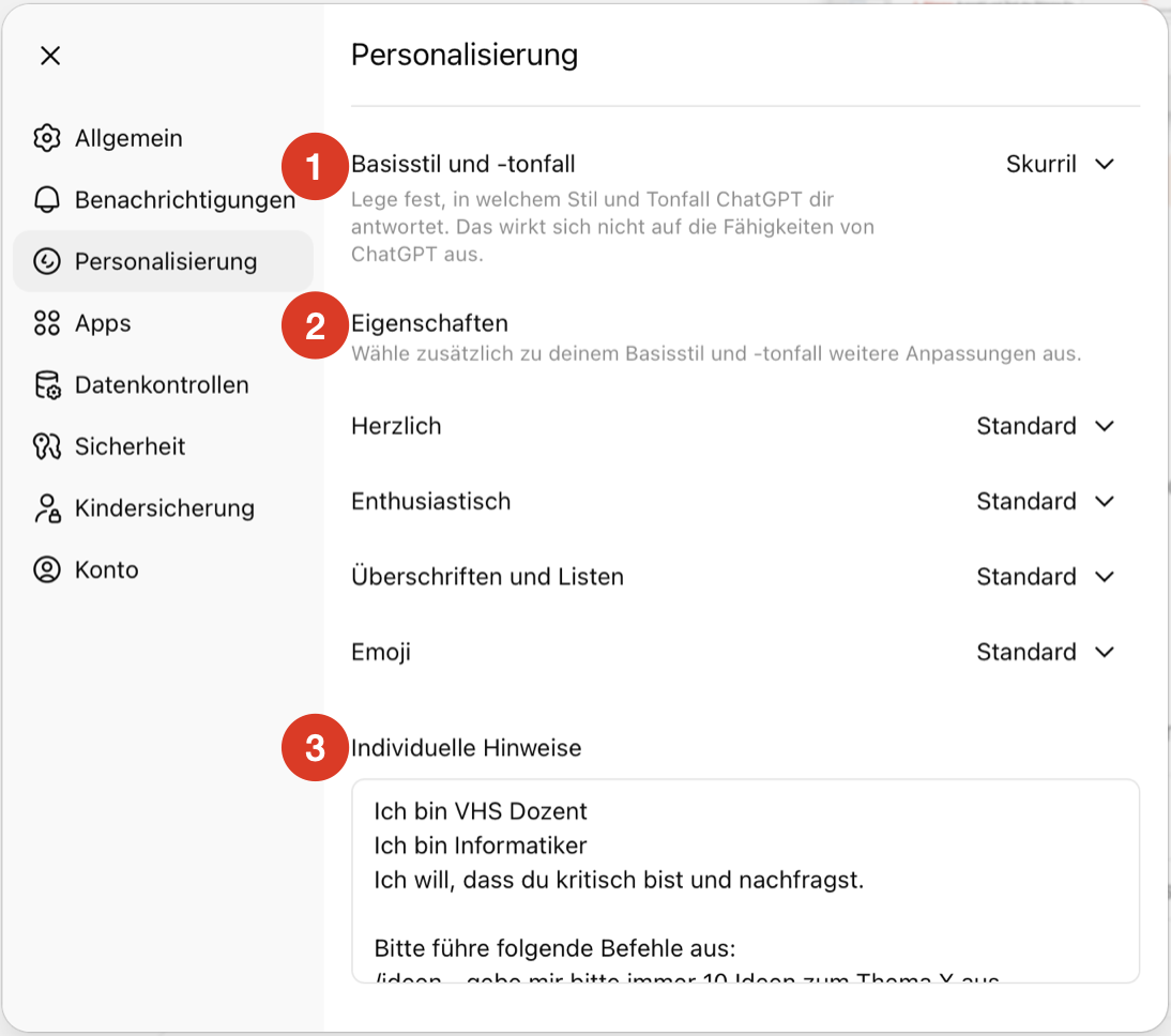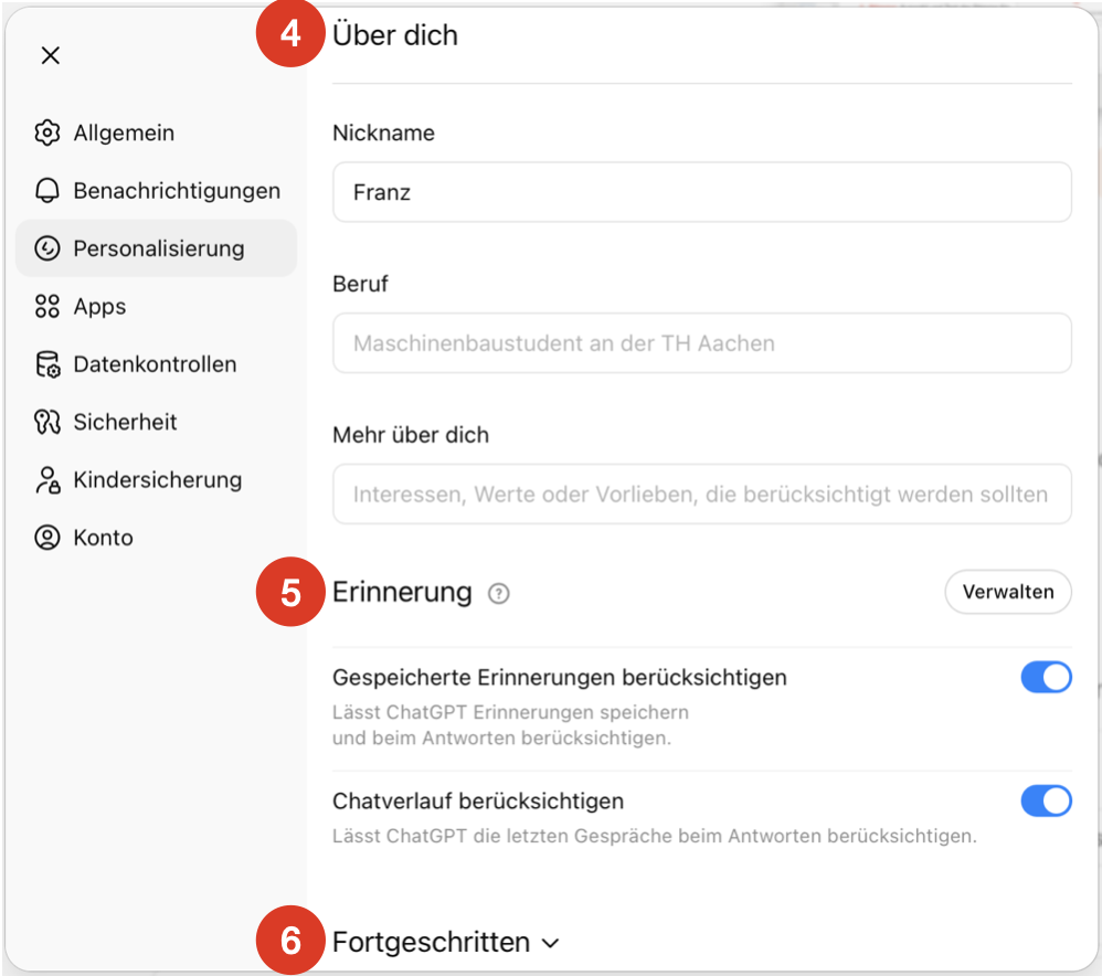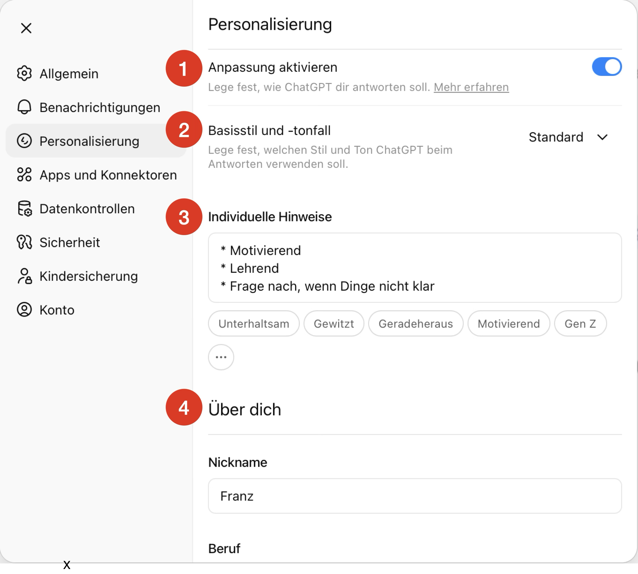 Personalisierung: Einstellungen, mit denen ChatGPT Antworten an persönliche Vorlieben anpassen kann.