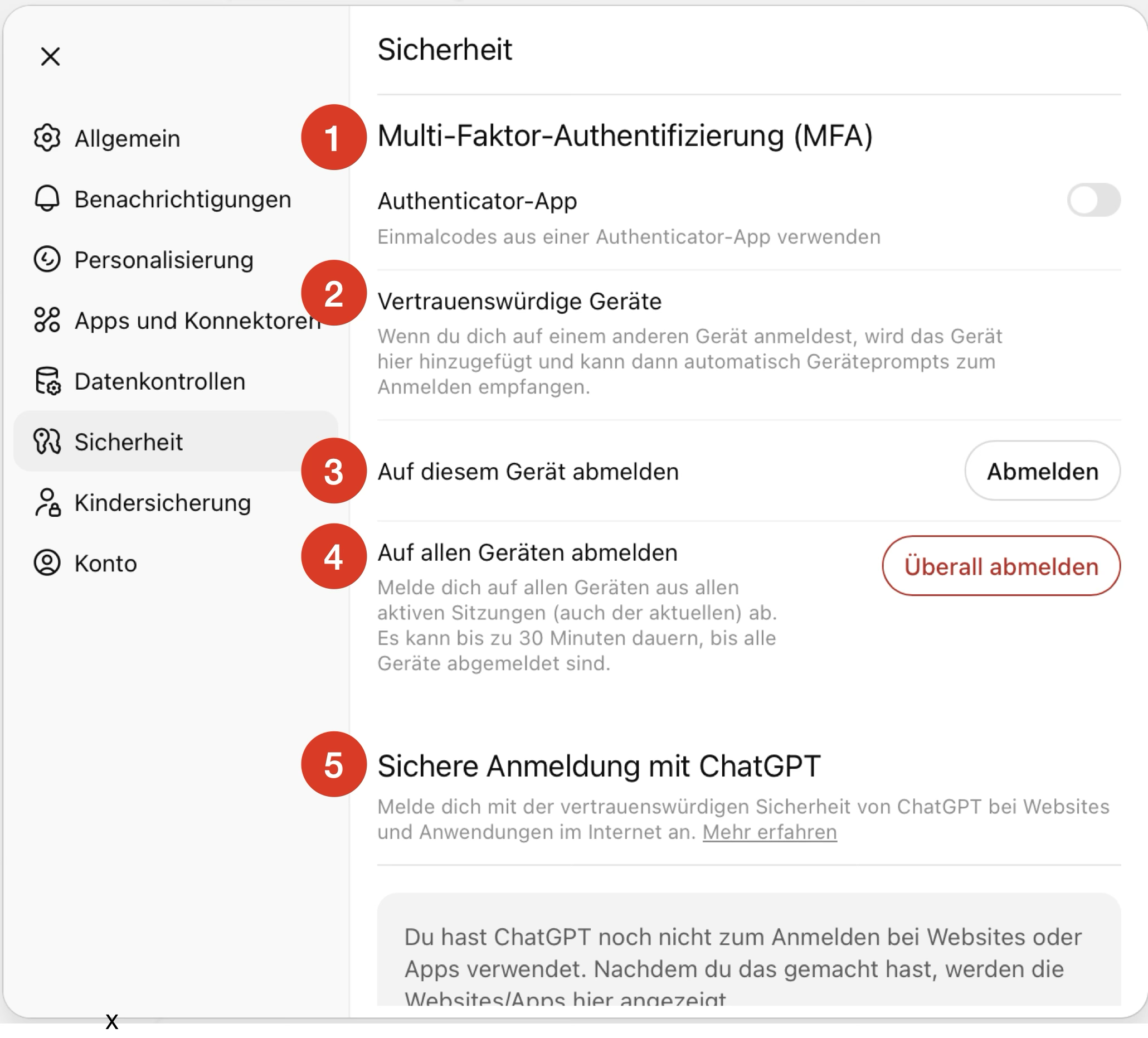 - Auf allen Geräten abmelden: Meldet von allen Geräten gleichzeitig ab (z. B. bei Verlust oder Fremdzugriff).
