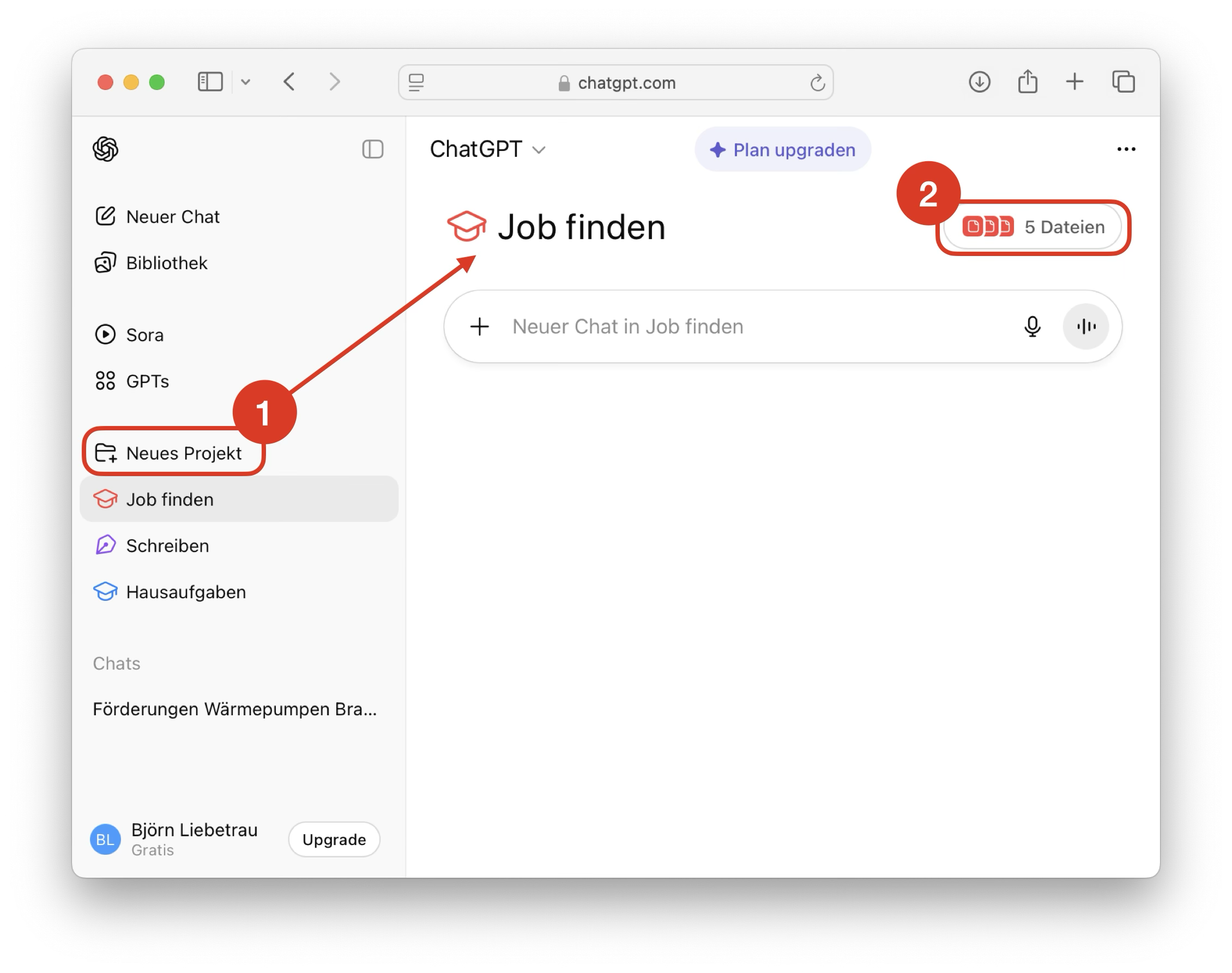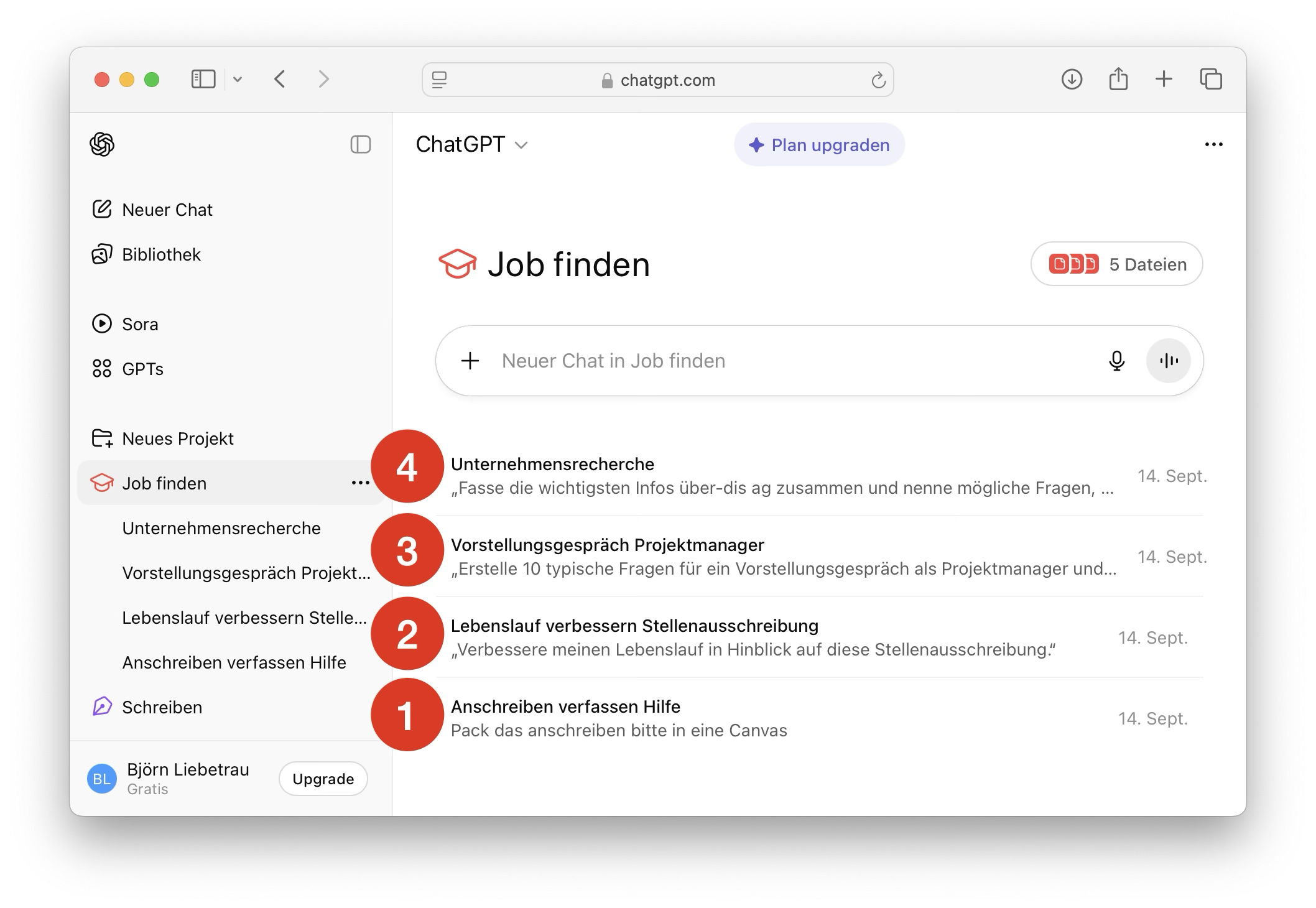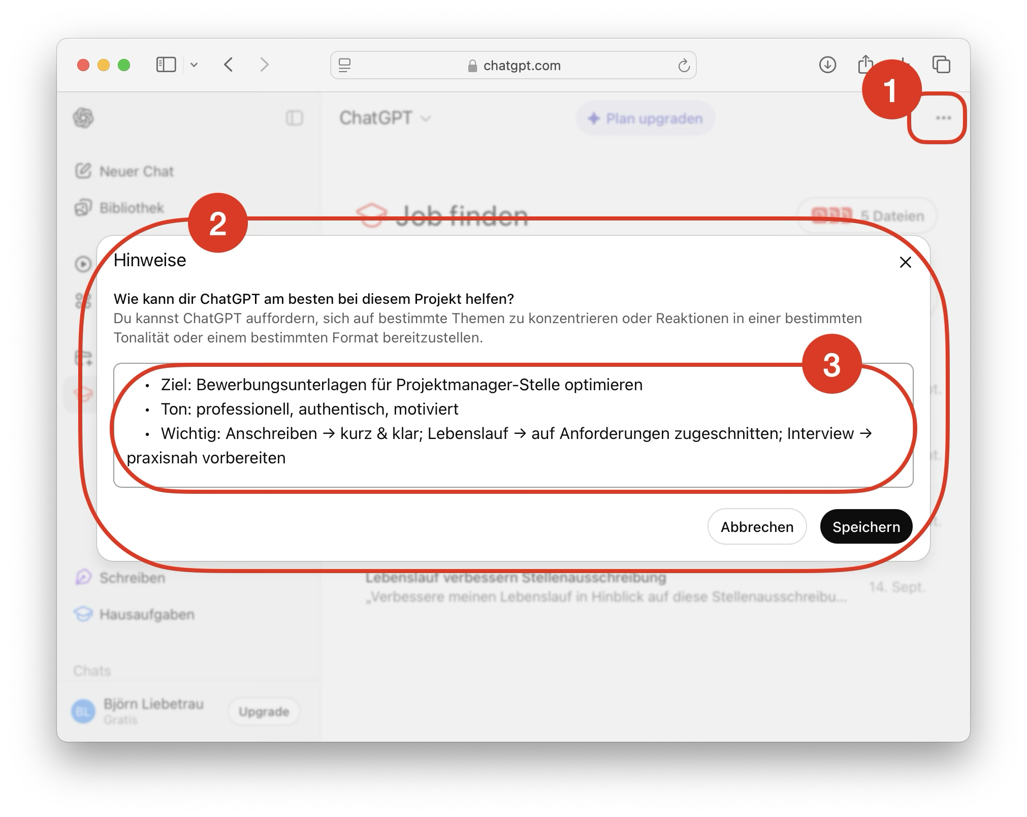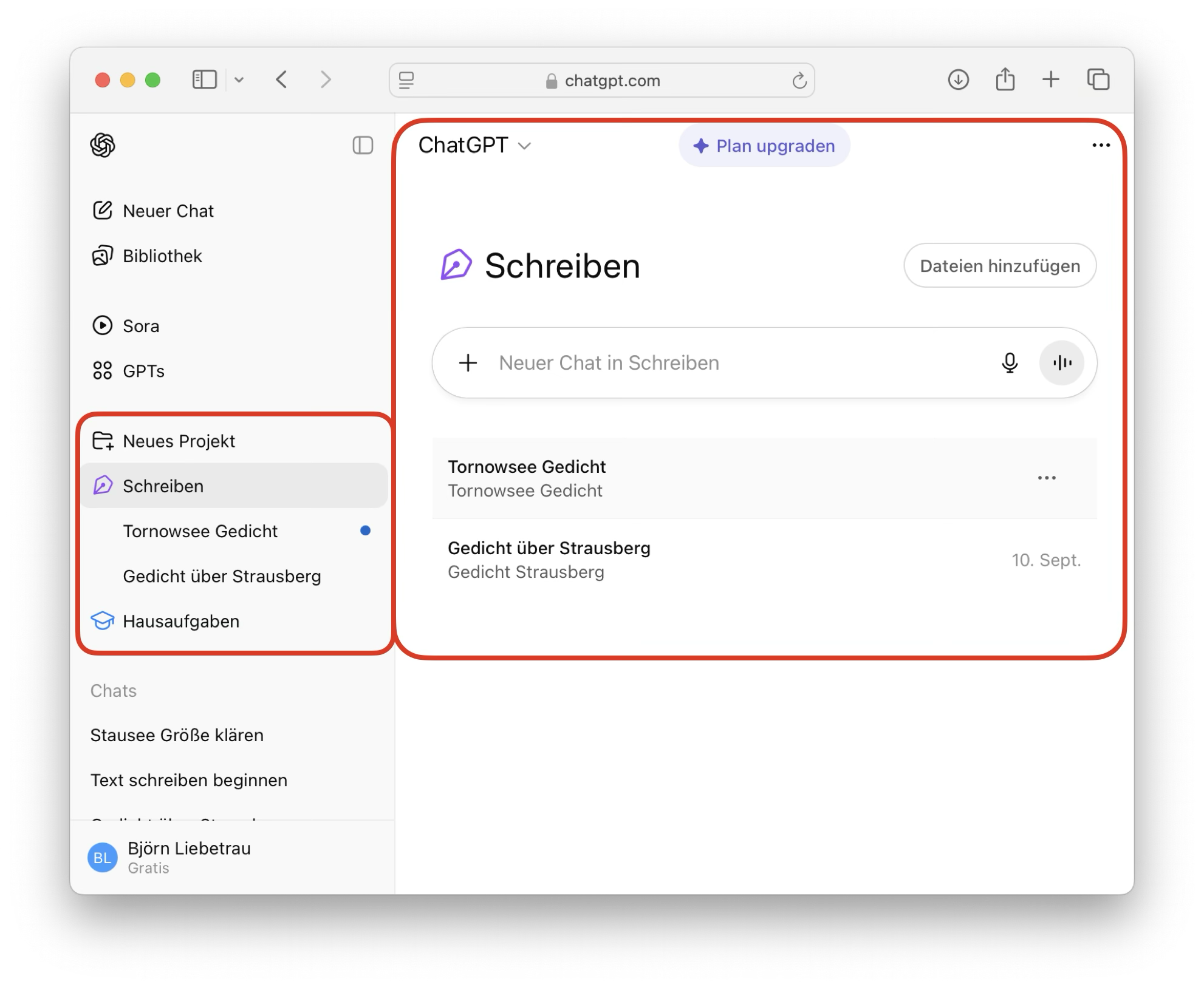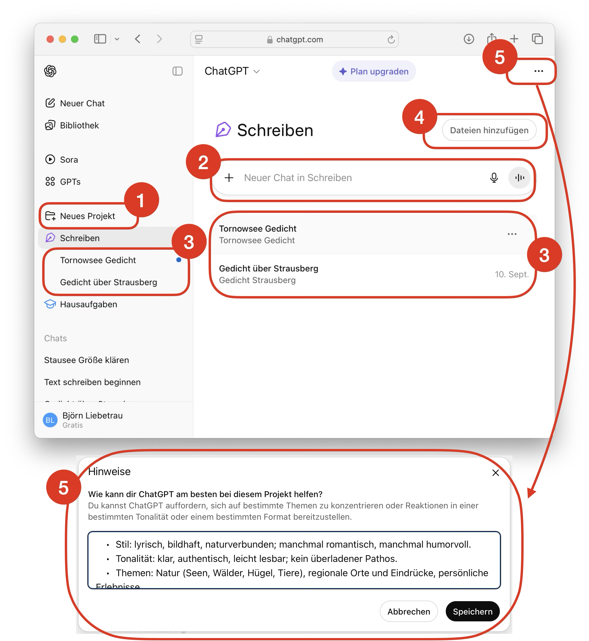 Projekte sind intelligente Arbeitsbereiche in ChatGPT, die alle relevanten Inhalte zu einem Thema sammeln: Chats, Dateien, Bilder, Canvas-Dokumente und projektspezifische Einstellungen. Dadurch bleibt der Kontext über längere Zeit erhalten, und Aufgaben lassen sich zusammenhängend, strukturiert und wiederholbar durchführen.