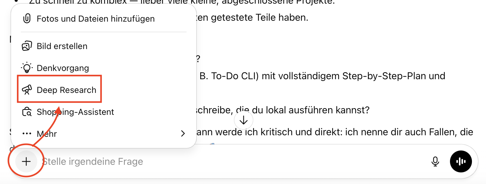Der Modus „Deep Research“ wird aktiviert unter „+“ neben dem Eingabefeld → „Deep Research“.