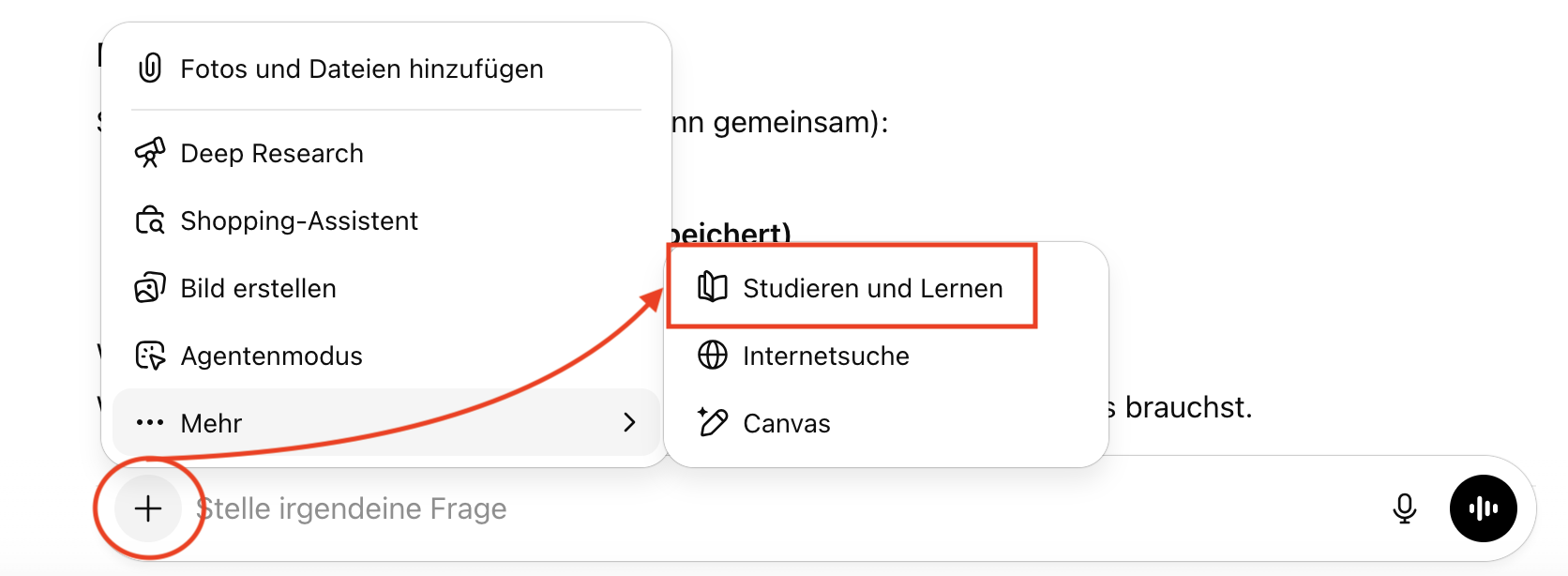 Modus "Studieren und Lernen" wird aktiviert unter "+" neben dem Eingabefeld und "... Mehr" » "Studieren und Lernen"