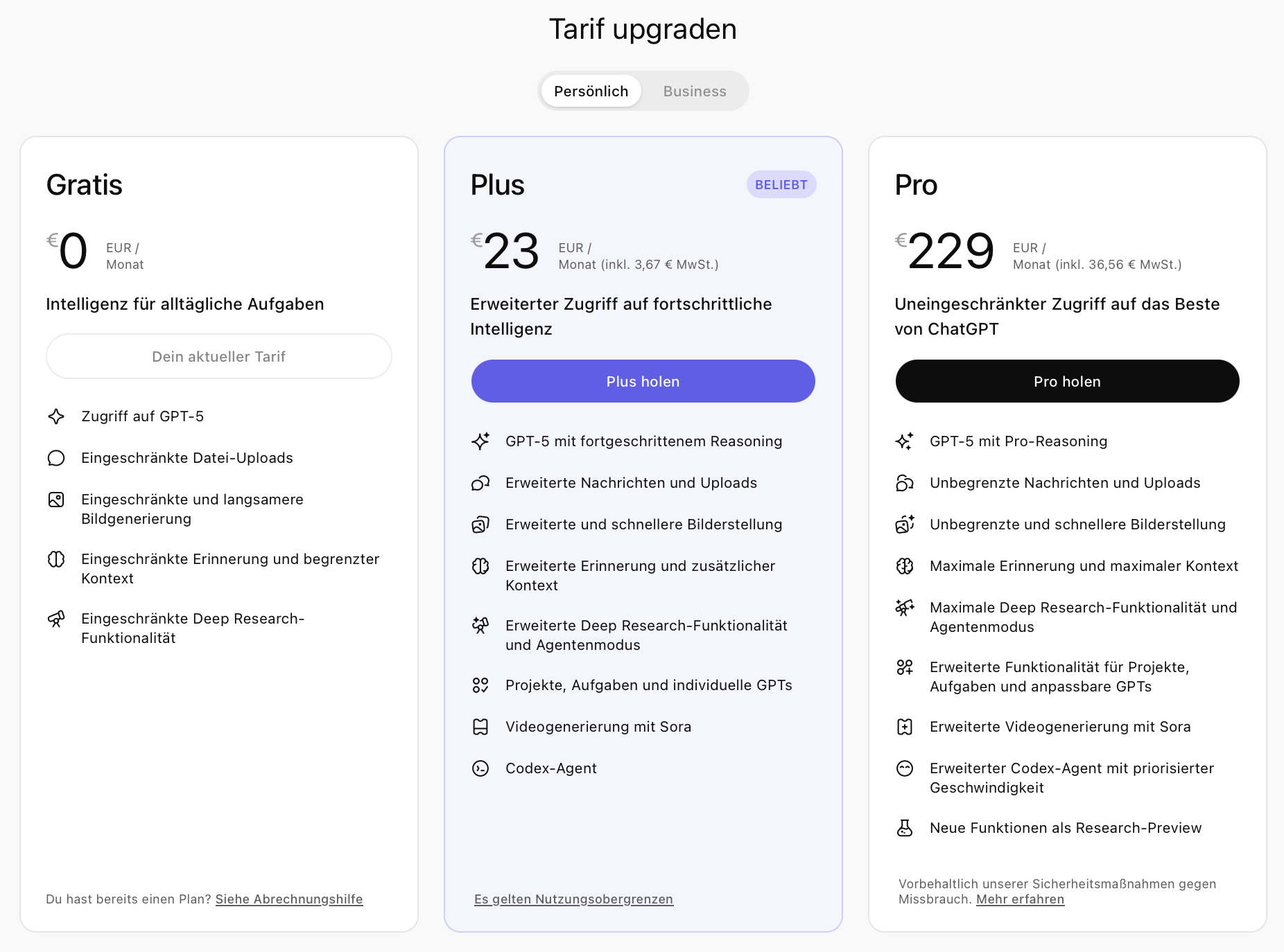 ChatGPT wird in drei Stufen angeboten: Gratis, Plus und Pro.